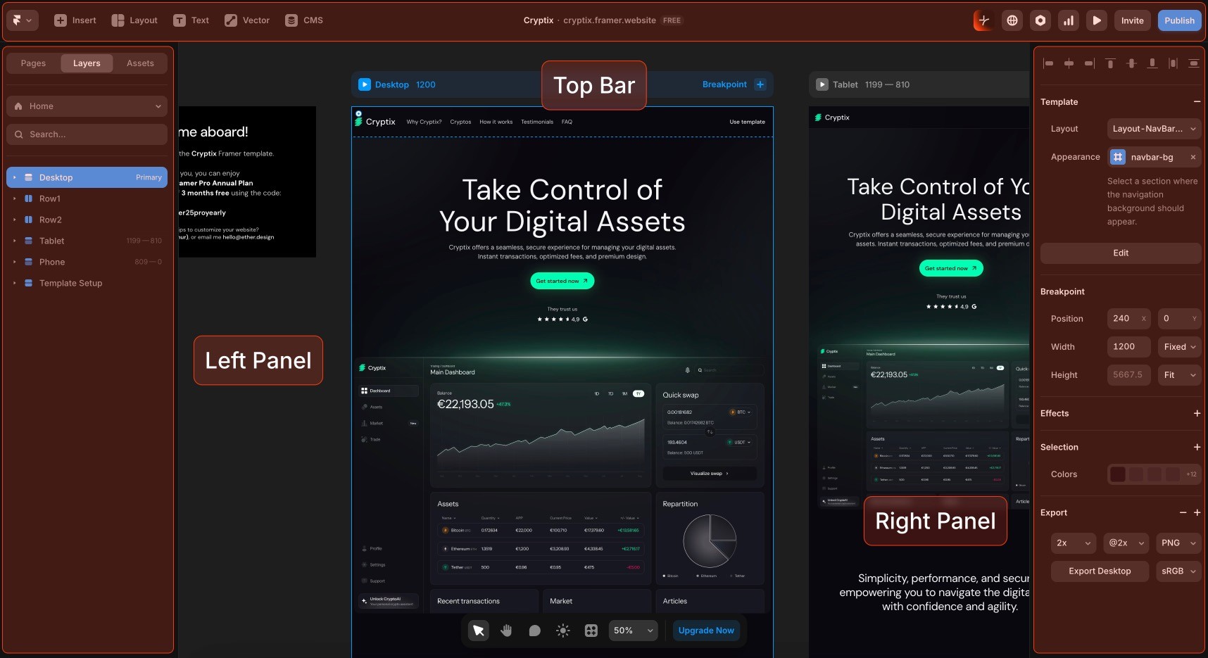 Left Panel: Pages list (your site's page structure) / Layers (Hierarchical view of page structure) / Assets (Components of your project)