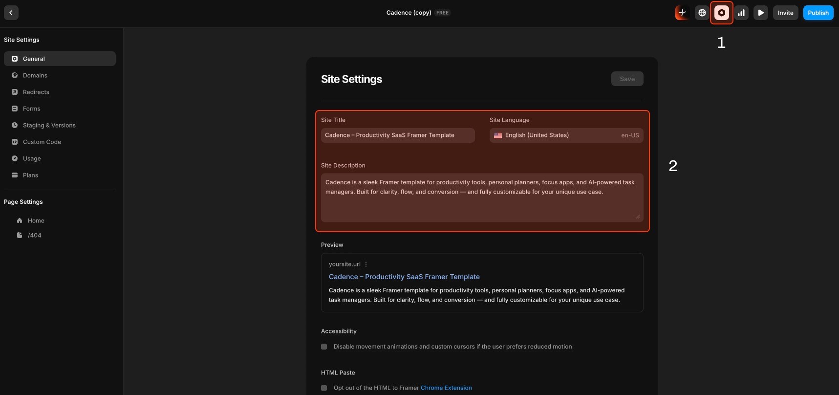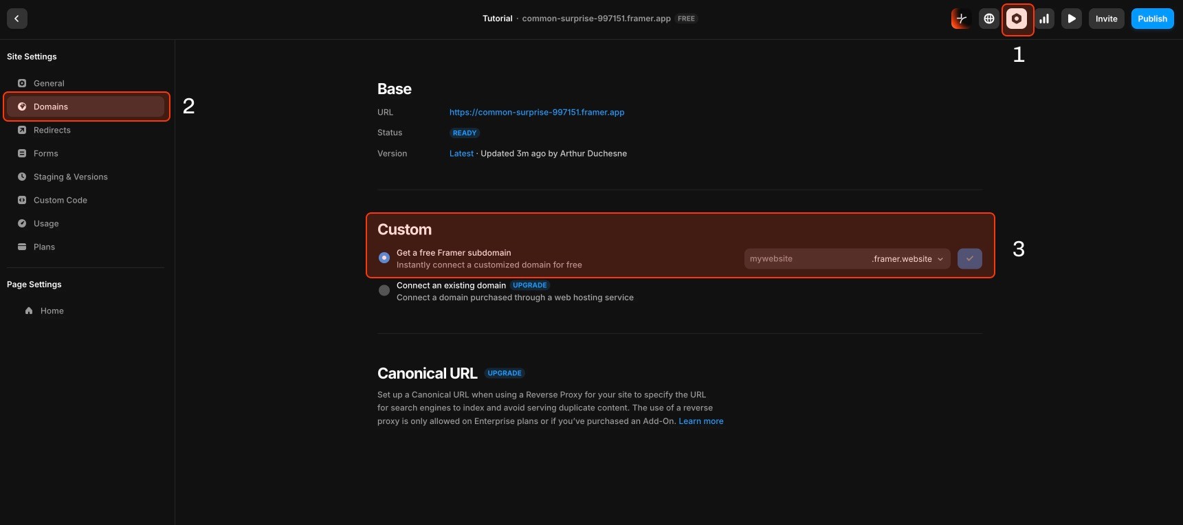 Site will be published on a default domain like common-surprise-12345.framer.app
